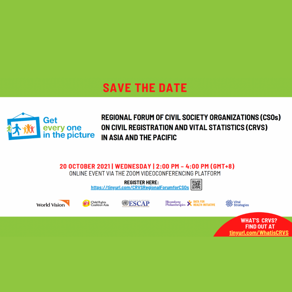 Child Rights Coalition Asia (CRC Asia), World Vision International (WVI), and the United Nations Economic and Social Commission for Asia and the Pacific (UN ESCAP) invite colleagues from different human rights organizations and organizations of professionals providing services related to CRVS to the Regional Forum of Civil Society Organizations (CSOs) on Civil Registration and Vital Statistics (CRVS) in Asia and the Pacific on 20 October 2021, 2:00 PM to 4:00 PM (GMT+8).