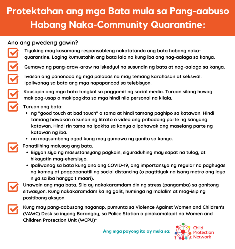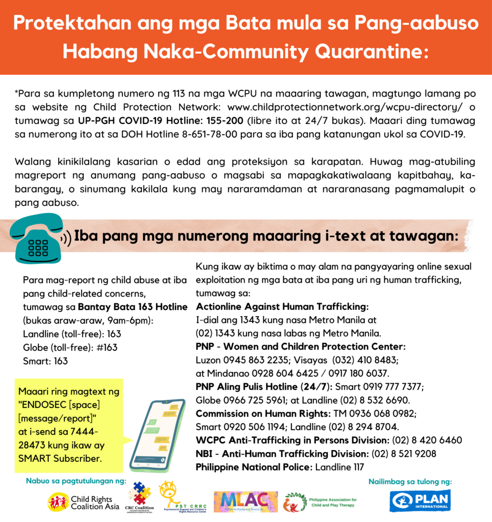 The material also contains the contact details of most of the country’s reputable and official government and private, non-government hotlines responding to child protection and other related concerns such as the Bantay Bata 163 Hotline, Actionline Against Human Trafficking, PNP-Women and Child Protection Center, PNP Aling Pulis Hotline (24/7), Commission on Human Rights, WCPC Anti-Trafficking in Persons Division, NBI-Anti-Human Trafficking Division, Philippine National Police, SMART’s nationwide #ENDOSEC hotline, and UP PGH COVID-19 Hotline.