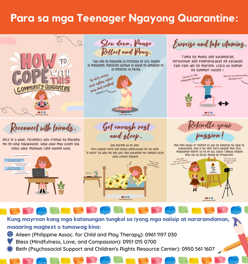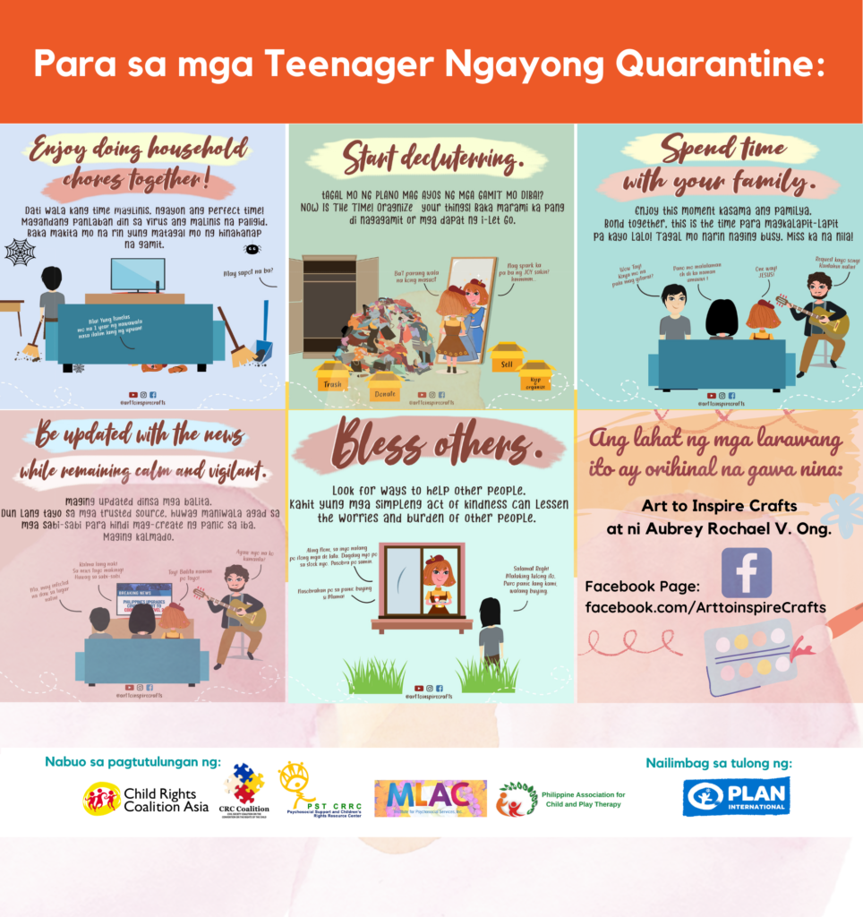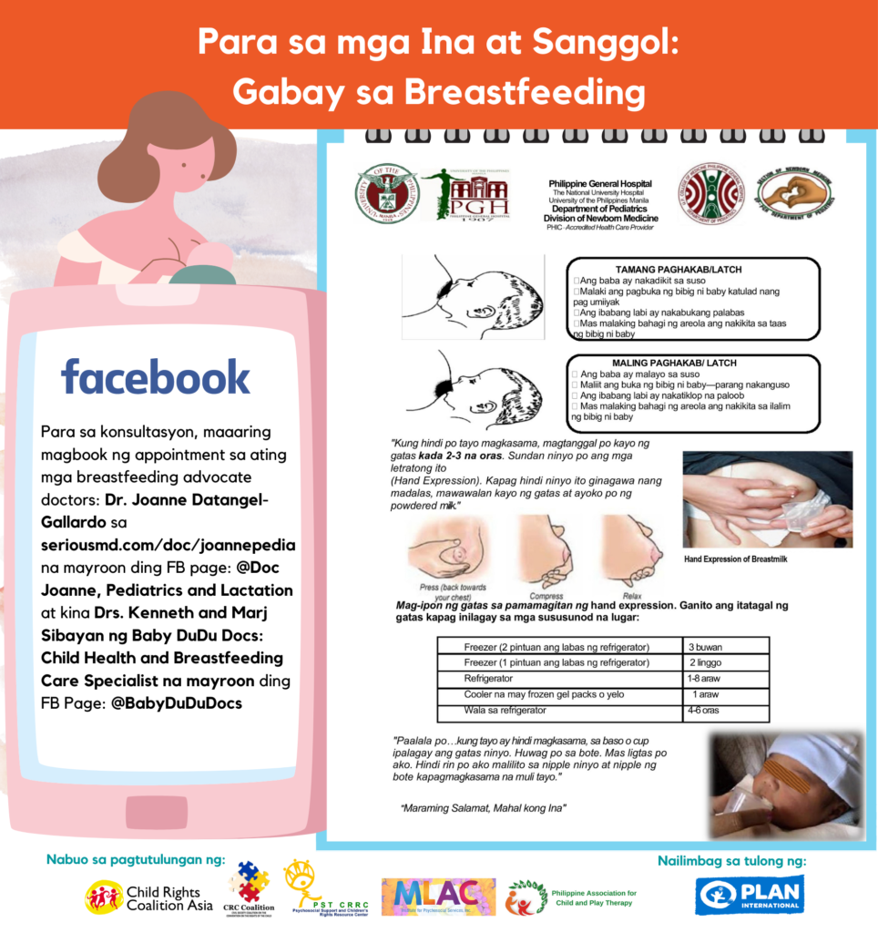 In partnership with Civil Society Coalition on the Convention on the Rights of the Child, Psychosocial Support and Children’s Rights Resource Center (PST CRRC), Philippine Association for Child and Play Therapy (PhilPlay), and Mindfulness, Love, and Compassion (MLAC) with support from Plan International, CRC Asia consolidated a set of information, education, and communication (IEC) materials for communities on important themes such as child protection, breastfeeding and infant and young child feeding, and mental health and psychosocial well-being for adolescents and parents and caregivers of children during the COVID-19 community quarantine.